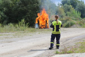 Jedoch, kurz bevor wir den Kleinbrand löschen konnten, entzündete sich mit mehreren kleinen geplanten Explosionen, eine Bushütte, die nur wenige Meter weiter entfernt stand, von selbst. Nach den ersten Schrecksekunden, erweiterten wir sofort den Löschaufbau und fingen an die Hütte abzulöschen. Währenddessen kamen, dank unseres Feuerwehr-Chemikers immer mal wieder kleinere ungefährliche Explosionen. Die Übung war ein voller Erfolg. Schließlich besprachen wir noch, nach Einsatzende, die jeweiligen Aufgaben, die während des Einsatzes mit Bravour erledigt wurden. Wir packten zusammen und fuhren wieder zum Gerätehaus, befüllten wieder das Auto und gönnten uns eine Pause.