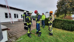 Am heutigen Abschlusstag wurden von unseren Ausbildern mehrere Stationen mit Aufgaben aufgebaut, die wir nun selbstständig abarbeiten mussten. Die Ausbilder waren zwar immer an unserer Seite und konnten uns Ratschläge geben, aber letztendlich waren wir für uns selbst verantwortlich. So retteten wir eine Person von einer Leiter im Schlauchturm, erkundeten das Dach des Feuerwehrhauses und richteten ein Geländerseil zur Sicherung von Arbeiten auf dem Sportheim ein.