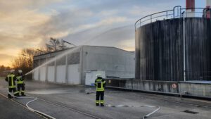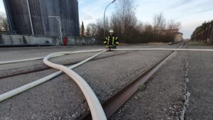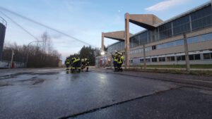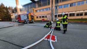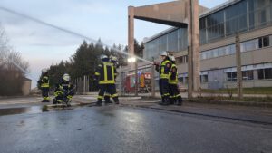Das betroffene Kraftwerk wurde im Rahmen der Übung zunächst mit unserem Mehrzweckfahrzeug (MZF) erkundet. Unser Einsatzleiter entschied sich dafür, den vermeintlichen Brand am betroffenen Gebäude von zwei Seiten anzugreifen. Während unser Löschgruppenfahrzeug (HLF) oberhalb des Kraftwerks den Löschangriff startete, kümmerte sich die Besatzung des Gerätewagen Logistik (GW-L) um den Löschangriff von der anderen Seite.