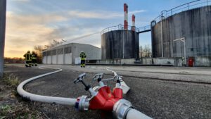 Zunächst wurde die Wasserversorgung aufgebaut, beim HLF wurde zeitgleich bereits mit der Wasserabgabe aus dem Tank begonnen um nahestehende Tanks zu kühlen. Nachdem die Wasserversorgung stand und die Wasserabgabe lief, wurden weitere notwendige Aufgaben verteilt. So mussten die Straßen gegen den fließenden Verkehr abgesichert und Schlauchbrücken aufgebaut werden. Da es bereits dämmerte, wurde die Einsatzstelle noch ausgeleuchtet.