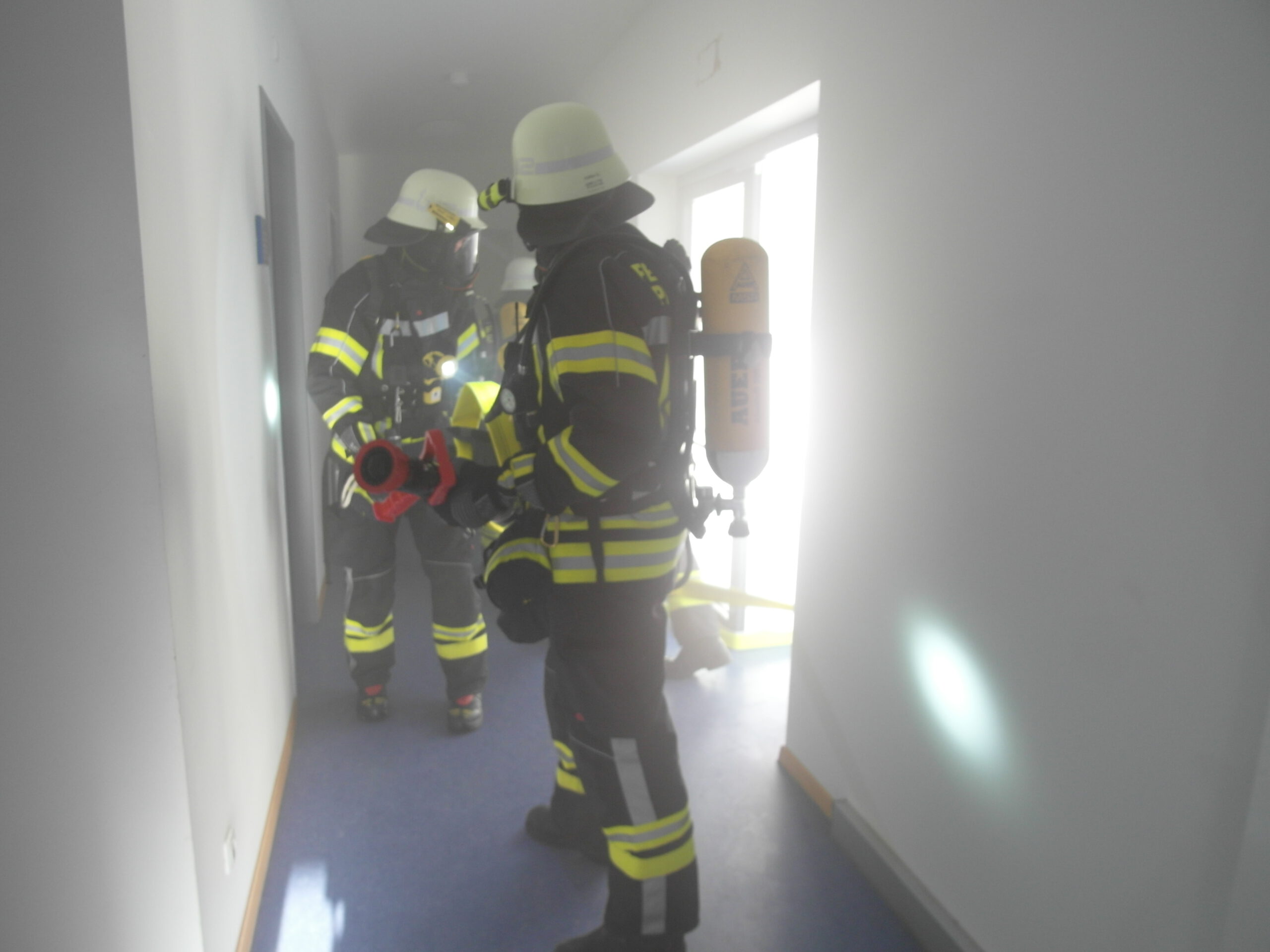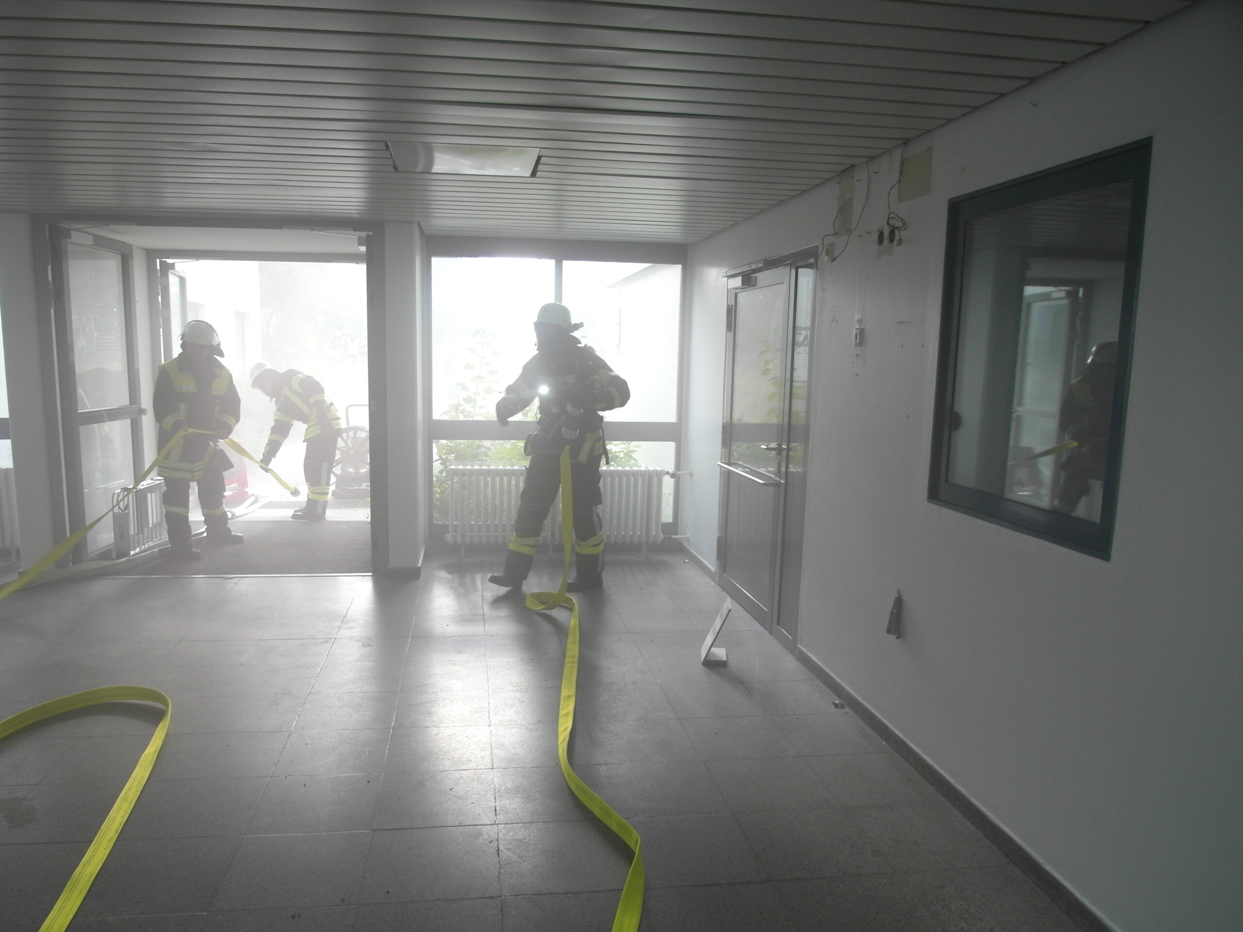 Nach kurzer Lagebesprechung der Einsatzleitung mit den Gruppenführern der 6 weiteren anwesenden Fahrzeuge wurden sofort mehrere Trupps unter Atemschutz losgeschickt, um Erdgeschoss, Obergeschoss und Keller zu durchsuchen. Während Trupps für die Wasserversorgung abgestellt wurden, mussten von den Atemschutzgeräteträgern weit über 50 Räume durchsucht werden, die auf langen Fluren in mehreren Flügeln des Gebäudes verteilt waren. Zeitgleich wurden über Leitern einige Schüler in Sicherheit gebracht. Die Suche im verrauchten Gebäude nach den vermissten Schülern gestaltete sich derweil schwierig, da diese auf Rufe nicht reagierten und die Suche sich im stark verwinkelten Gebäude sehr zeitintensiv zeigte.