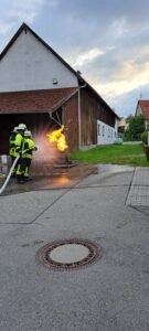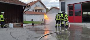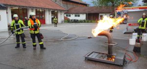 In einer weiteren Station bauten wir einen Löschaufbau auf und beübten die Nutzung von Hohlstrahlrohren. Diese bieten uns im Einsatz vielseitige Funktionen. Vom Löschen mittels Vollstrahl (hohe Wassermenge punktuell) bis zum feinen Wassernebel, der eine hohe Kühlwirkung hat und unseren Kameraden gleichzeitig einen Schutz vor entgegenschlagenden Flammen bietet. Hierfür nutzten wir den Feuerlöschtrainer der Kreisbrandinspektion Landsberg.