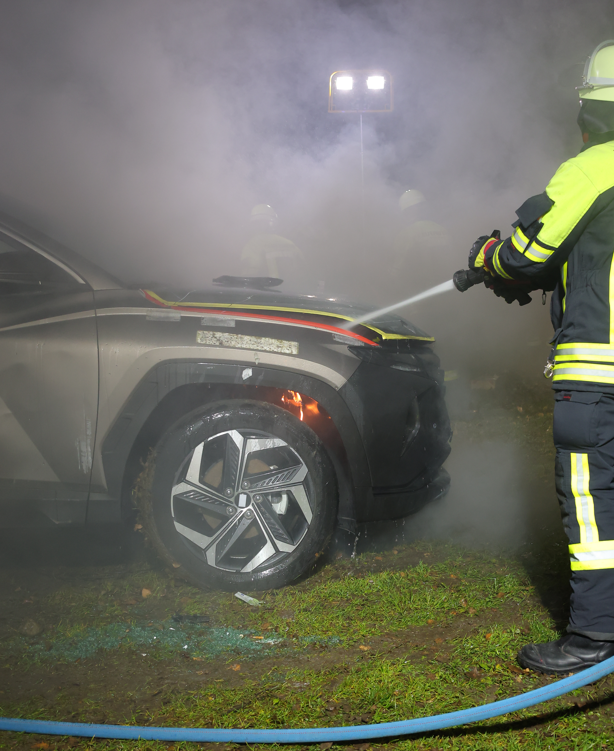 Nach einer Kollision in einer Ortskreuzung kamen beide Fahrzeuge im Grünbereich zum Stehen, eines davon auf der Seite liegend. Im laufe der Übung fing eines der Fahrzeuge Feuer und musste schnell abgelöscht werden.