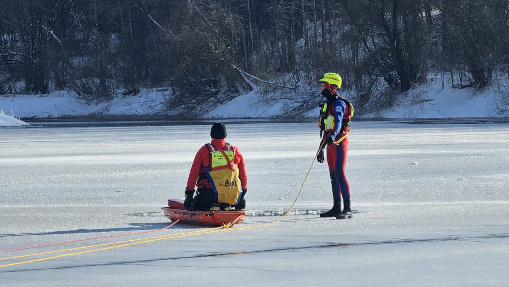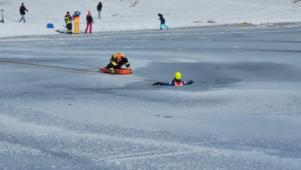 Im Mittelpunkt stand der fachliche Austausch: Die Wasserwacht teilte ihre Erfahrungen und ihr Wissen zur Rettung aus eingebrochenem Eis mit uns und wir führten die Ideen mit unserem Equipment durch. Für unsere Einsatzkräfte war es eine sehr lehrreiche Ausbildung, bei der verschiedene Rettungsmöglichkeiten und deren Vor- und Nachteile, praktisch erprobt werden konnten. Während der gesamten Übung waren alle Einsatzkräfte, die auf dem Eis arbeiteten, durchgehend mit einem Seil gesichert, um sie jederzeit zügig wieder an Land ziehen zu können. Das war nicht nur für den Übungszweck, sondern auch für unsere Sicherheit notwendig, da das Eis zahlreiche Risse zeigte und nur bedingt tragfähig war.