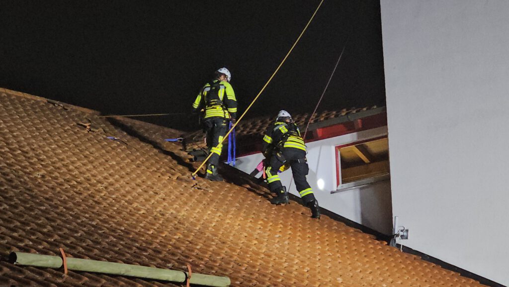 Angenommen wurde folgende Einsatzlage: Ein Kind war auf das Dach eines Gebäudes gelangt und konnte dieses nicht mehr eigenständig verlassen. Die Rettung musste unter Sicherung mittels Seilsystem erfolgen.